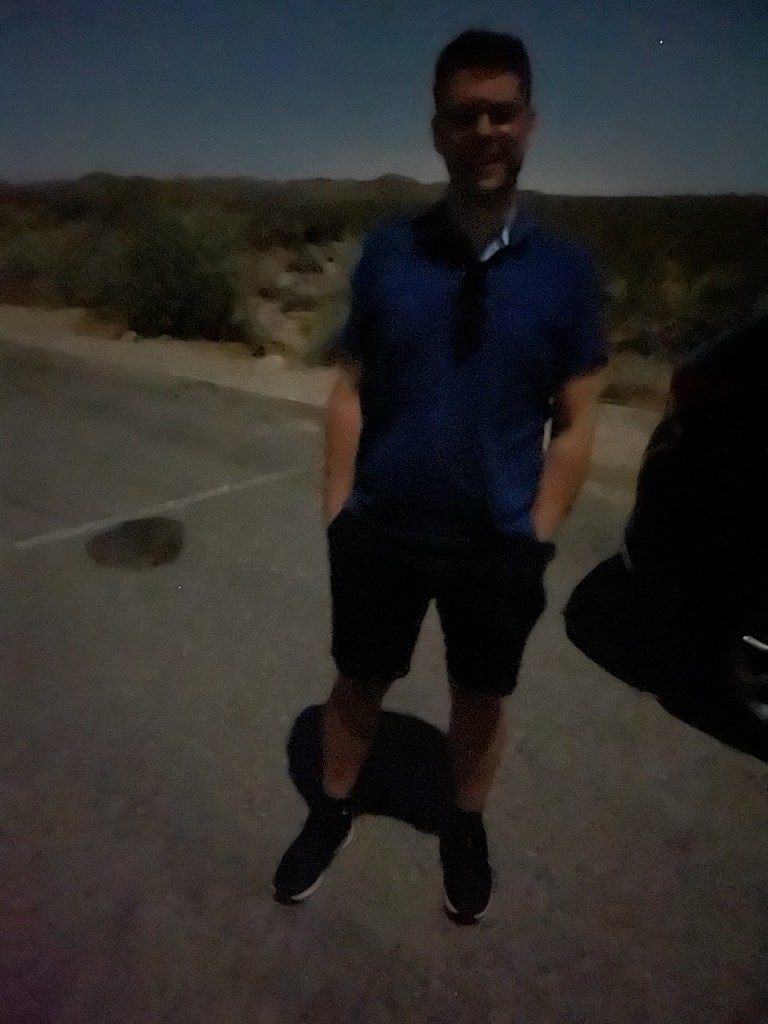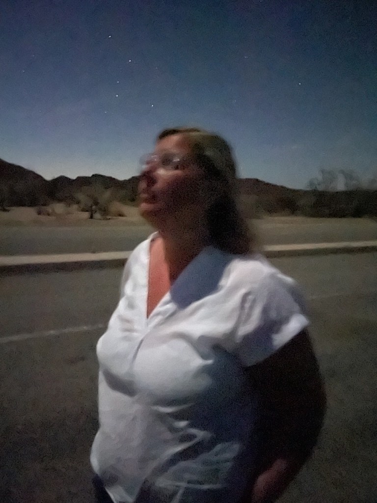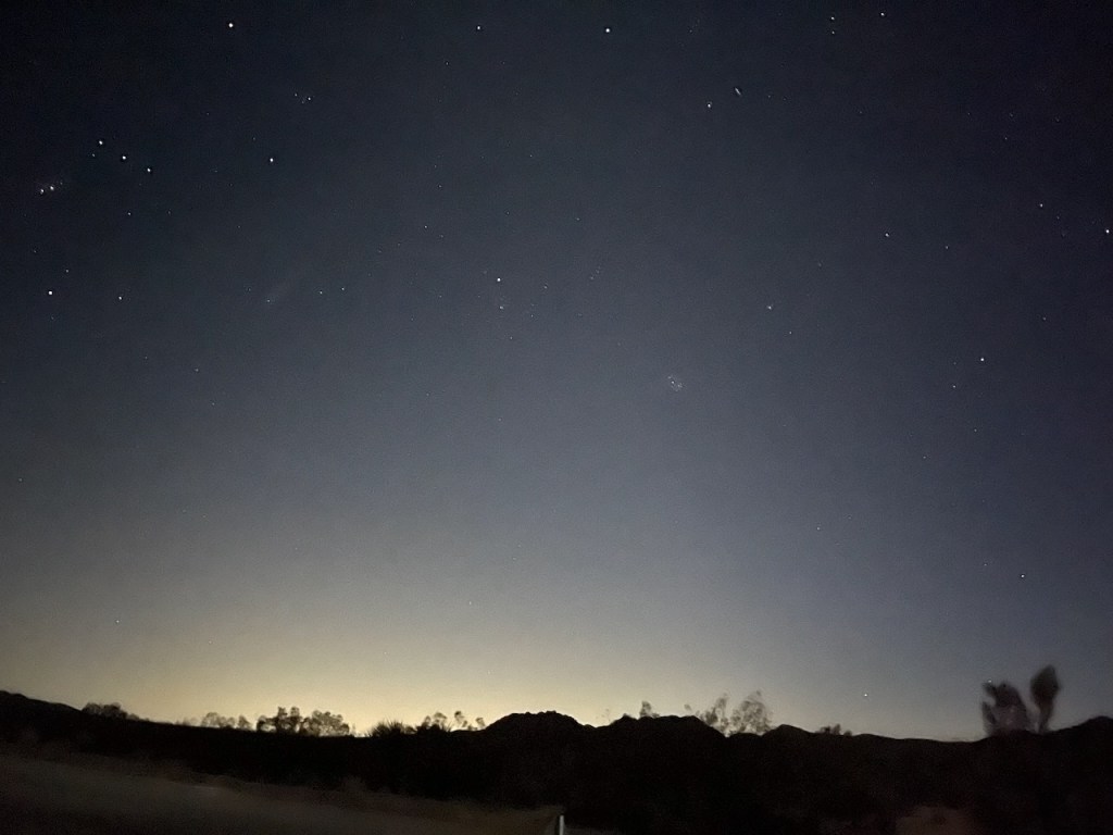 Vi åt middag på The Old Spaghetti Factory, ingen överraskning vad de serverar för typ av mat där! Sen hade jag fått för mig att jag ville se en ordentlig stjärnhimmel med triljoner av stjärnor, ni vet sådär häftigt man kan se på TV… Så när solen höll på att gå ner åkte vi österut in i Joshua Tree National Park, ett ökenområde några mil härifrån. Eller vi är ju redan i öknen, med ni fattar. Vi parkerade mitt ute i ingenstans, stängde av alla ljus på bilen och väntade. Tyvärr hade jag inte gjort research på vart månen var i sin fas, och det var naturligtvis halvmåne och den stod mitt på himlen och lyste upp hela jäkla världen (kändes det som). Som ni ser på bilderna blev vi inte överväldigade, men bilderna kommer verkligen inte till sin rätt heller, för ingen av oss hade nog nånsin sett så många stjärnor samtidigt. Så lite häftigt var det ju. Men vi ska göra bättre research och komma tillbaka en annan resa där månen inte förstör, och ha bättre förutsättningar för att se bättre. Och kanske lära oss några fler stjärntecken än Orions bälte och Stora Karlavagnen.