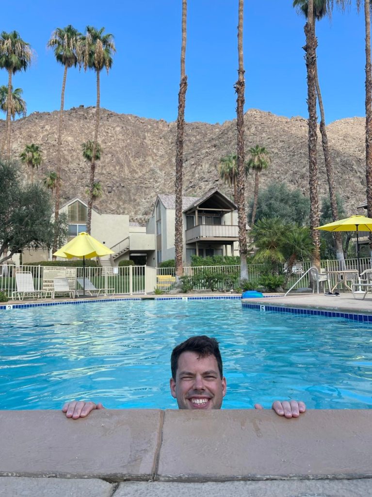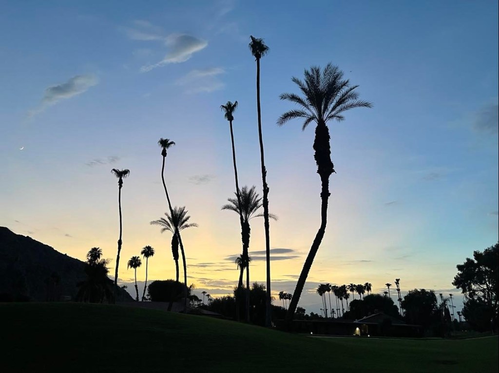 Vi avsluttet dagen med en spontan tur opp i Mount San Jacinto for å se om vi kunne se en fin soldnedgang. Dessverre feilberegnet vi litt på tiden, solen hadde allerede gått ned når vi kom opp til et av utsiktspunktene. Heldigvis bare 25 minutter å kjøre, så vi får heller prøve igjen en annen gang. Når vi kom hjem gikk vi en kort runde inne på området og Elin tok et nytt bilde til samlingen ”Palmer i solnedgang”.