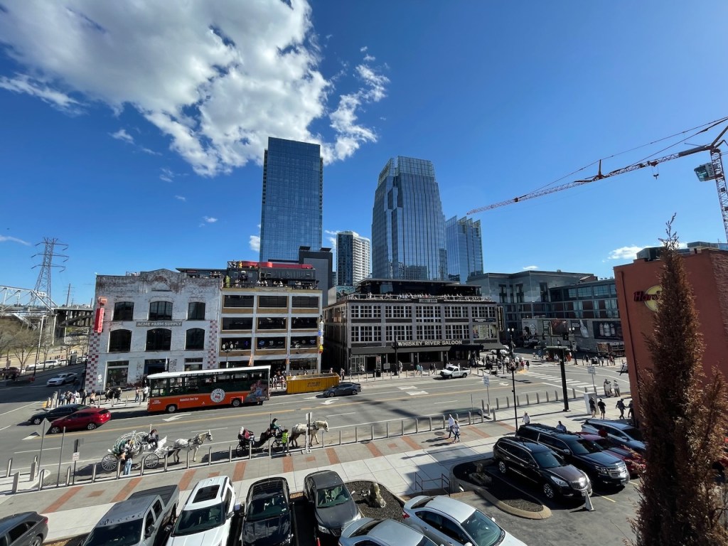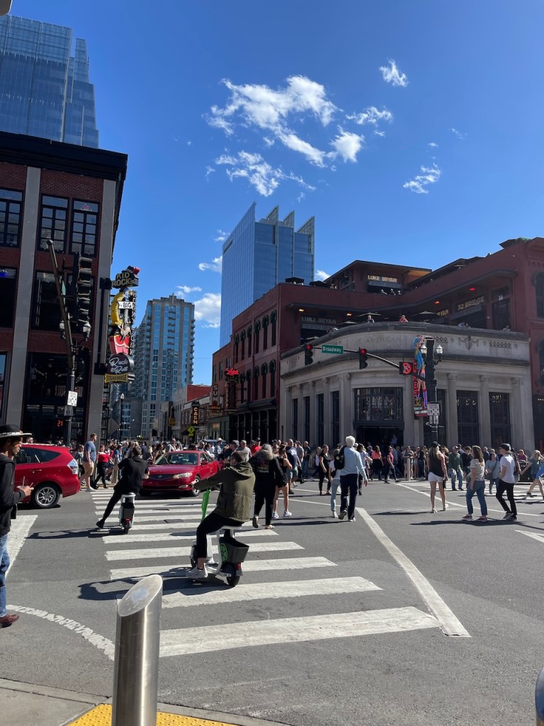 Huvudgatan här i Nashville heter Broadway och det är här det händer! Här ligger alla barer och affärer tätt och det är extremt mycket folk och liv. Ljudnivån är hög på grund av att alla barer har fönster och dörrar öppna så musiken strömmar ut. Så här kan det till exempel se ut