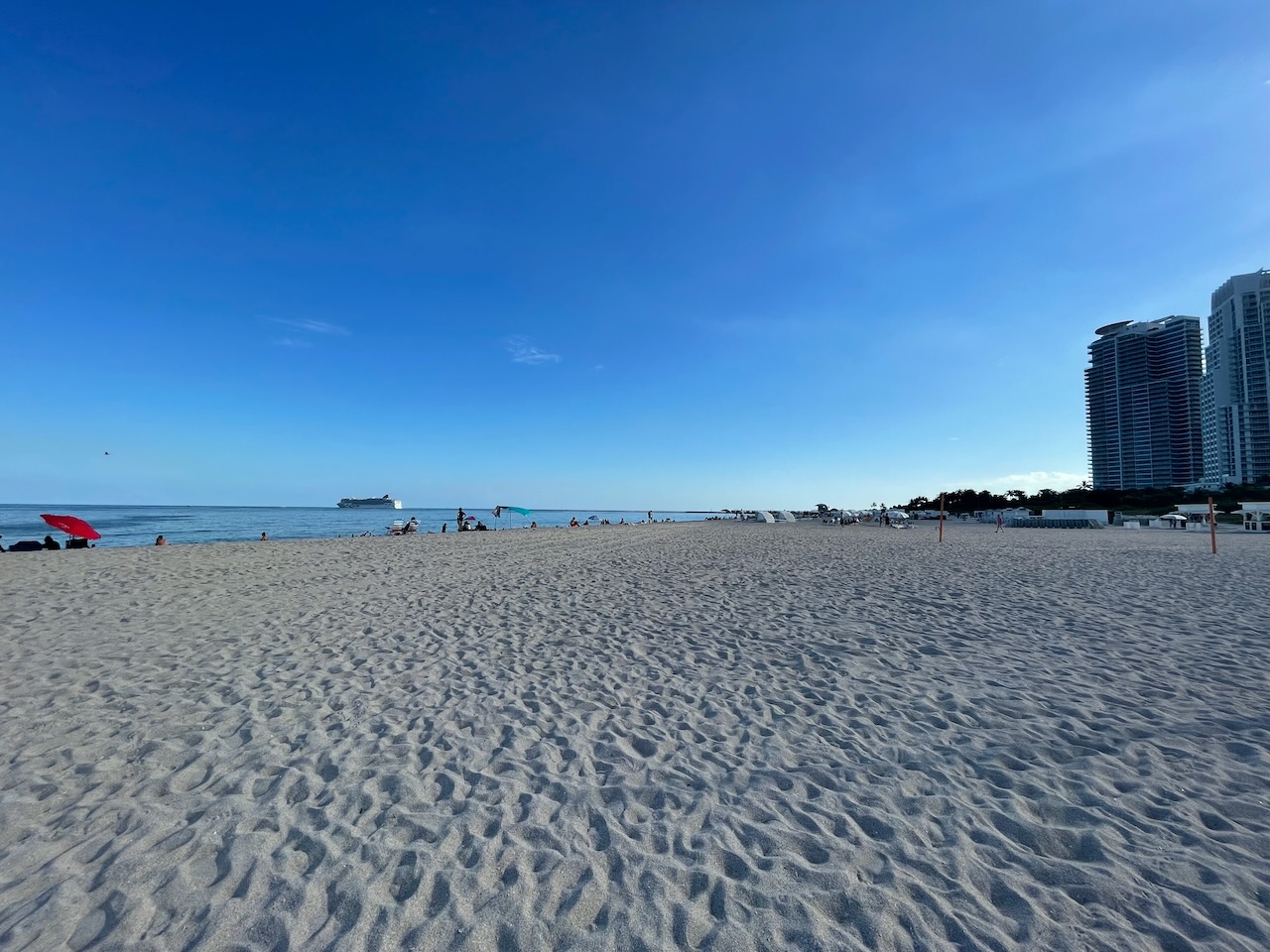 Vi gick norrut och njöt av värme och solsken. Gick ner på stranden, det var ganska sent på eftermiddagen men fortfarande en del folk där. Vi såg en cruisebåt lämna hamnen. Espen googlade fram att en lägenhet i ett av höghusen nere vid stranden kunde bli vår för runt 40 miljoner kr, eller så kunde vi hyra den för 500.000 kr i månaden. Som hittat.