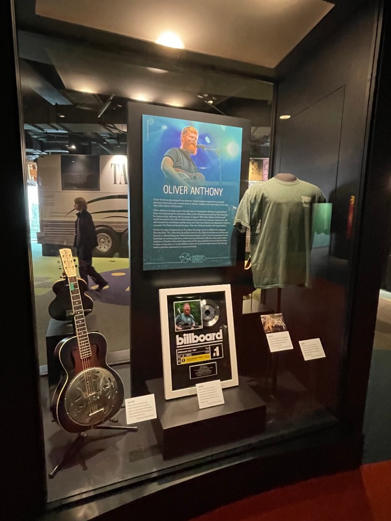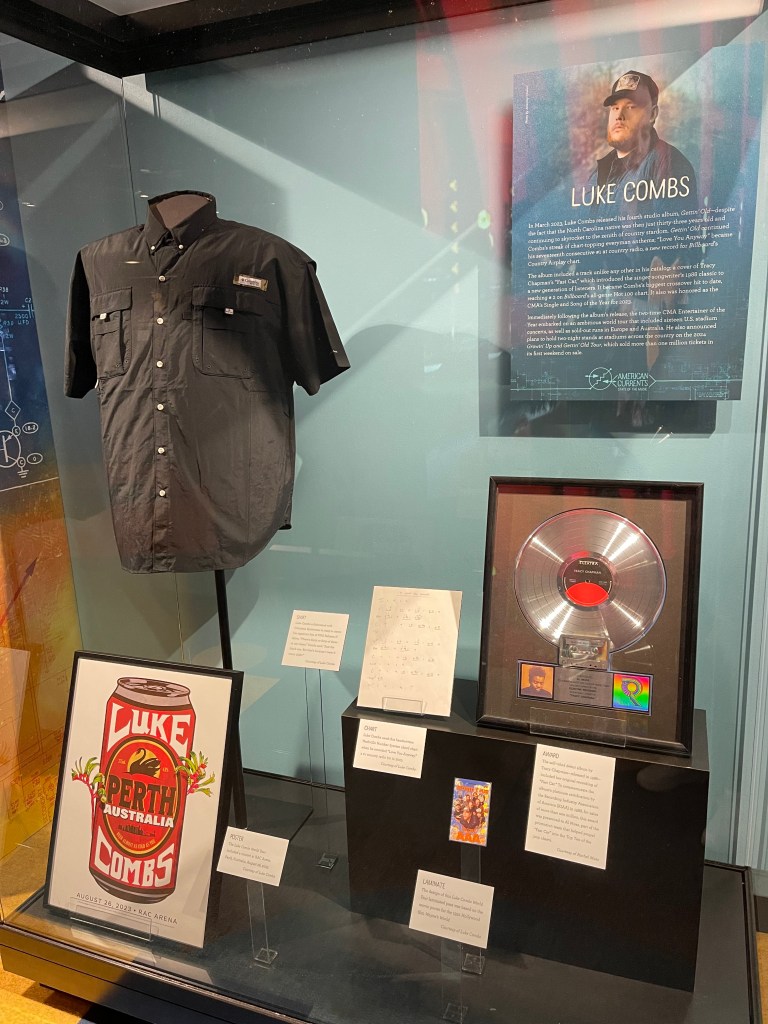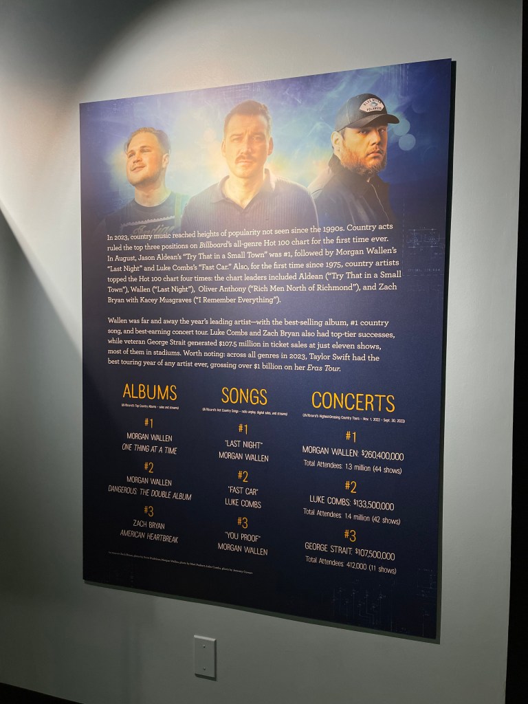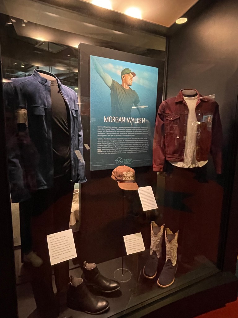Den andre delen av utstillingen strekker seg fra 1960 frem til nåtid. Her kjenner vi naturlig nok igjen mye mer og vi brukte mer tid her. Vi fant fort både Morgan Wallen, Luke Combs og Oliver Anthony – tre artister vi har vært på konsert med det siste året.